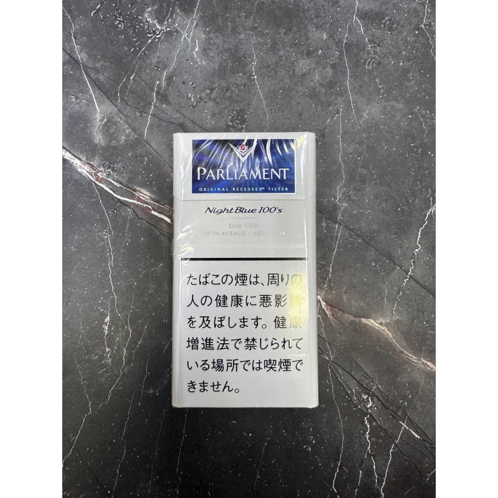 PARLIAMENT NIGHT BLUE 100s — японский релиз легендарной линейки Parliament с фирменным утопленным фильтром Recessed Filter. Формат 100s (удлинённые сигареты ~100 мм) даёт более плавную тягу и ровное горение. Модель Night Blue в японском duty free позиционируется как средне-крепкая и «чистая» по вкусу.